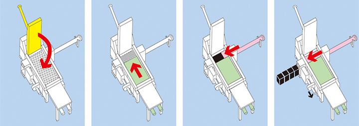 低級屑・新断材・廃家電等各種のスクラップを、製鉄原料として適合するサイズに圧縮成型。