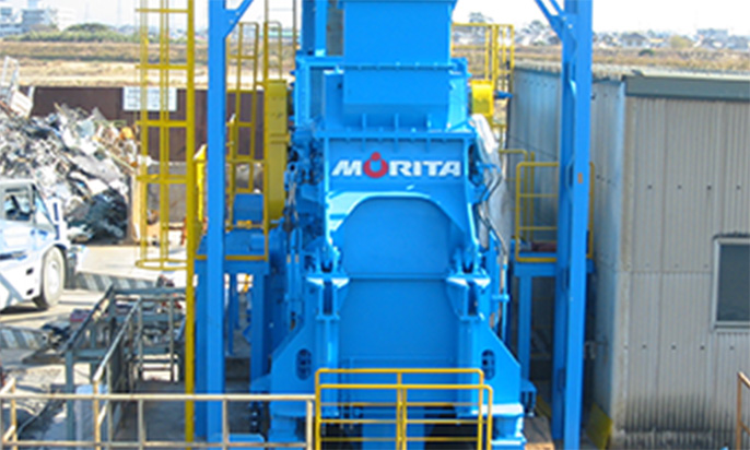 プレシュレッダで粗破砕したスクラップを粒状に粉砕するモリタ環境テックの高機能破砕機
