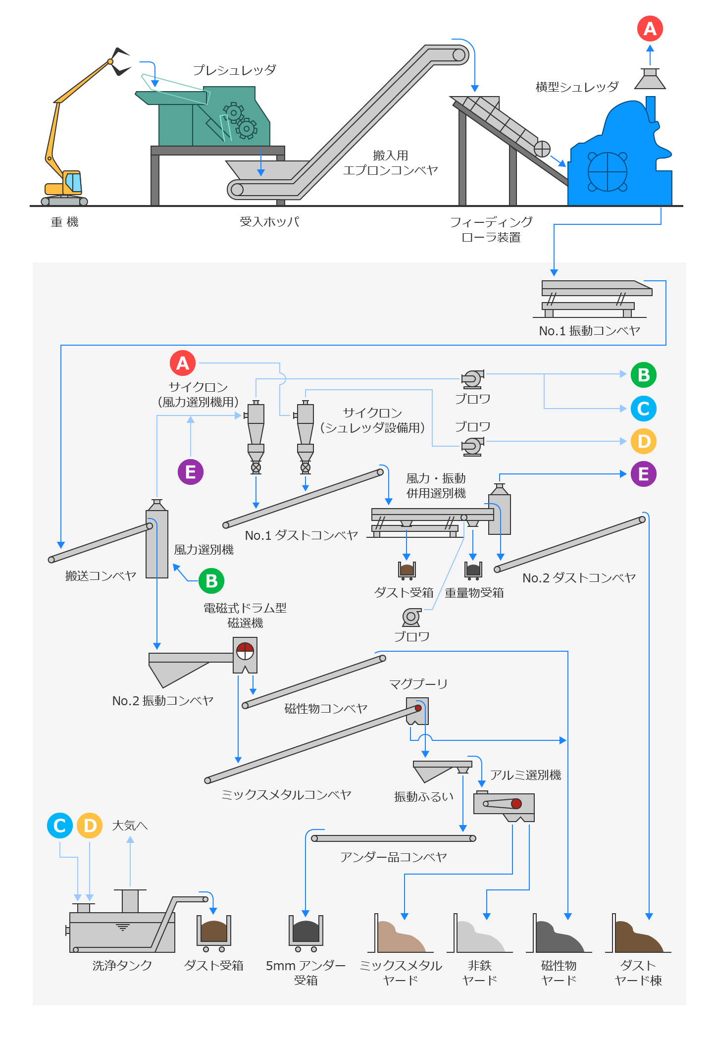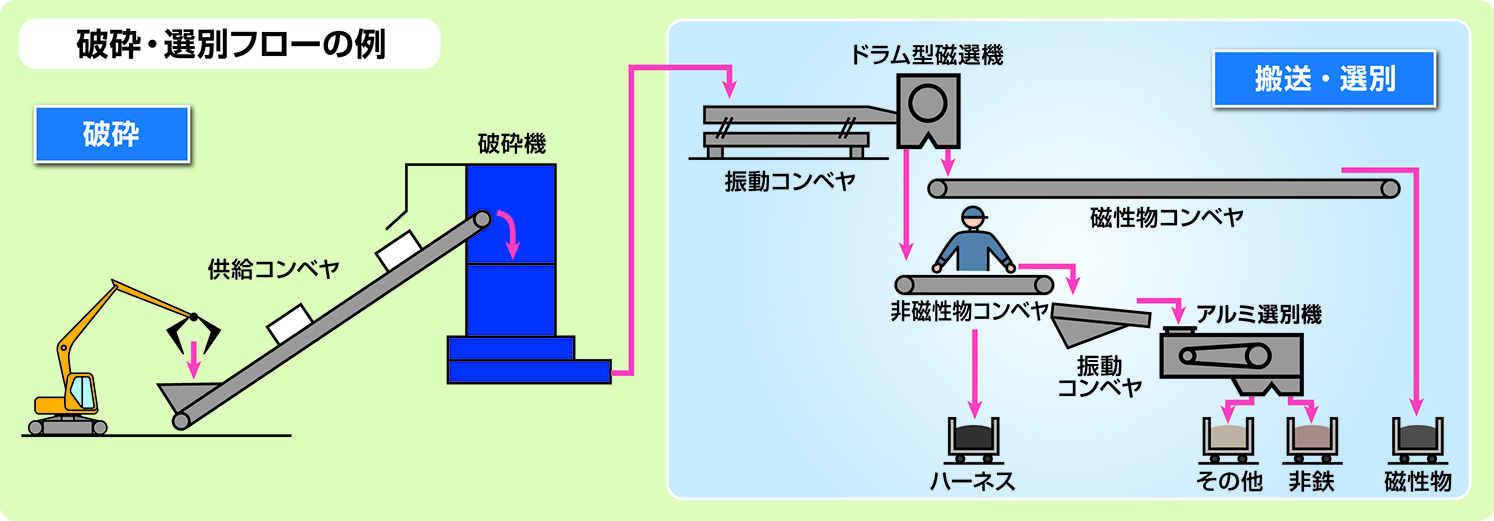 横型シュレッダプラントは、廃自動車・雑品をプレシュレッダ・シュレッダにより破砕し、金属・プラスチック・ゴム・ウレタン・ガラスの中から、磁力選別機・風力選別機・粒度選別機・アルミ選別機を通して有価物を最大限回収し、シュレッダダストを少なくするプラントになっております。
