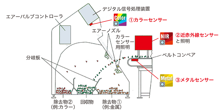 高解像度センサーと最先端信号処理技術により高い検知精度を実現。よりスピーディに、より確実に選別します。また、高速エアーバルブにより正確にエアーブローでき、高い排出精度を実現しました。