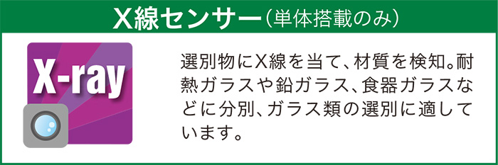 「バリソート」の秘密兵器は高解像度のマルチセンサー。最大3つのセンサーを組み合わせることで、今までセンサー単品ではできなかった多様な選別が、可能になりました。各センサーはモジュール化され、選別物の種類や選別目的に合わせ、自由な組み合わせやグレードアップ、交換が容易にできます。また、「バリソート」はX線センサーの搭載が可能、選別の幅が広がります。